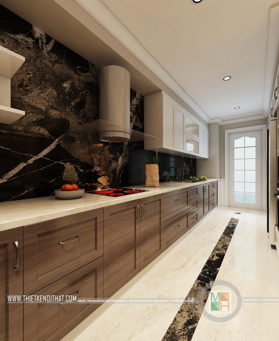 Với gam màu nâu trầm bạn chỉ cần sử dụng tủ bếp dưới chất liệu tủ bếp gỗ tự nhiên óc chó kết hợp cùng tủ bếp trên chất liệu acrylic gam màu trắng sẽ tạo nên sự đồng điệu hài hòa trong không gian bếp.