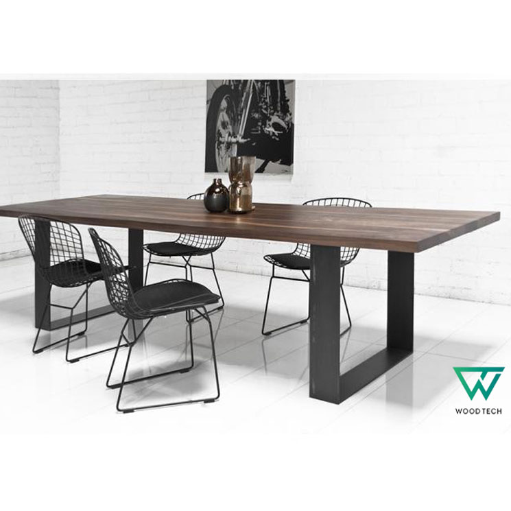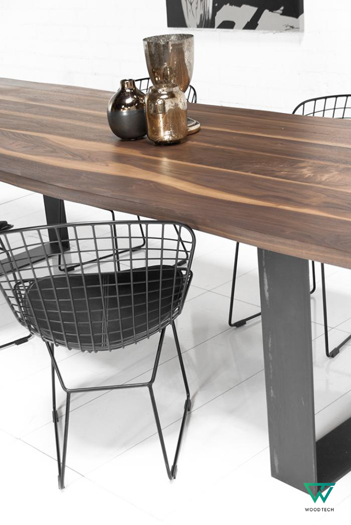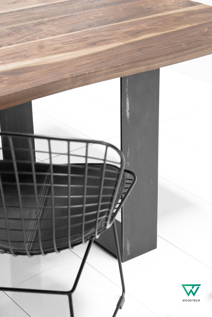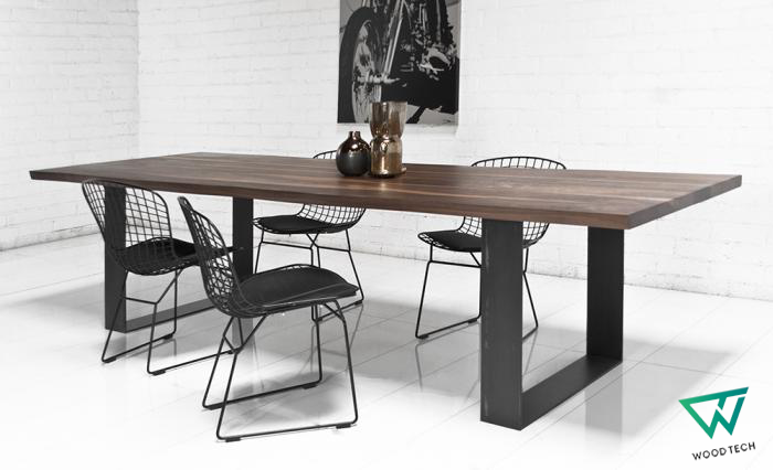 Bộ bàn ghế gỗ óc chó đã đập tan sự tương phản sâu sắc trong thiết kế hiện đại cùng sự phối hợp những chiếc ghế chất liệu thép với khung chân chữ U tạo nên nét chấm phá độc đáo. Bạn có thể thấy sự phối hợp vô cùng khéo léo của chiếc bàn gỗ óc chó đơn giản với thiết kế khối hình chữ nhật nhưng lại tạo nên không gian vô cùng sang trọng, tinh tế bởi chất liệu gỗ óc chó đã tạo nên nét quyến rũ ấn tượng từ những đường vân uốn cong đẹp mắt cùng độ bóng sáng ấn tượng.