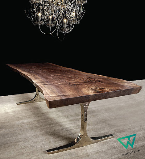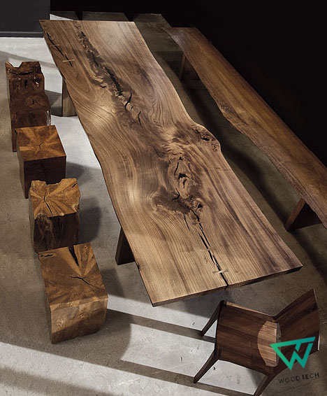 Màu sắc gỗ trầm, tâm gỗ với những đường vân cuộn xoáy, những vết nứt tự nhiên được mài nhẵn nhụi và cẩn thận. Bộ bàn ghế này đơn giản và rất thô sơ với tâm niêm tôn trong những vẻ đẹp sẵn có của cự nhiên. Bàn ăn được thiết kế dài khổ ngang to phù hợp cho những căn nhà có diện tích rộng. Các người thợ không đẽo gọt những họa tiết cầu kì mà để nguyên những chỗ nhấp nhô của ván gỗ đã được mài thật mịn. Nét tự nhiên làm nên vẻ độc đáo. Những chiếc ghế được lấy nguyên từ những thân gỗ đã qua xử lí với bốn chiếc ghế được xếp cạnh nhau. Ngoài ra, còn một chiếc ghế dài được tạo ra từ những ván gỗ tự nhiên. Bộ bàn ghế không cầu kì, kiểu cách nhưng lại rất tự nhiên mang lại một cảm giác thân thiện, trang nhã cho căn hộ của gia đình.