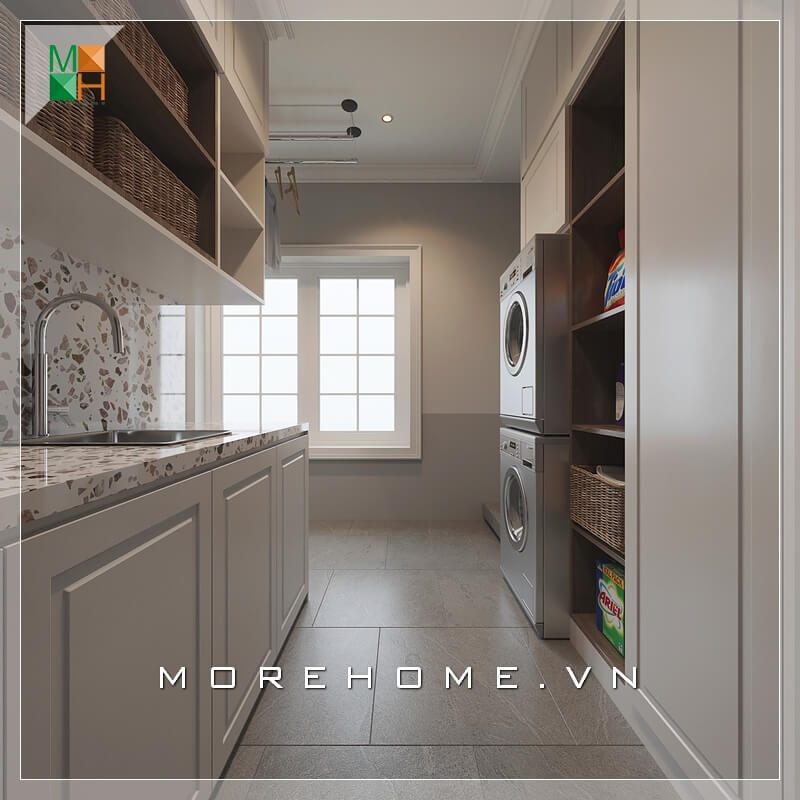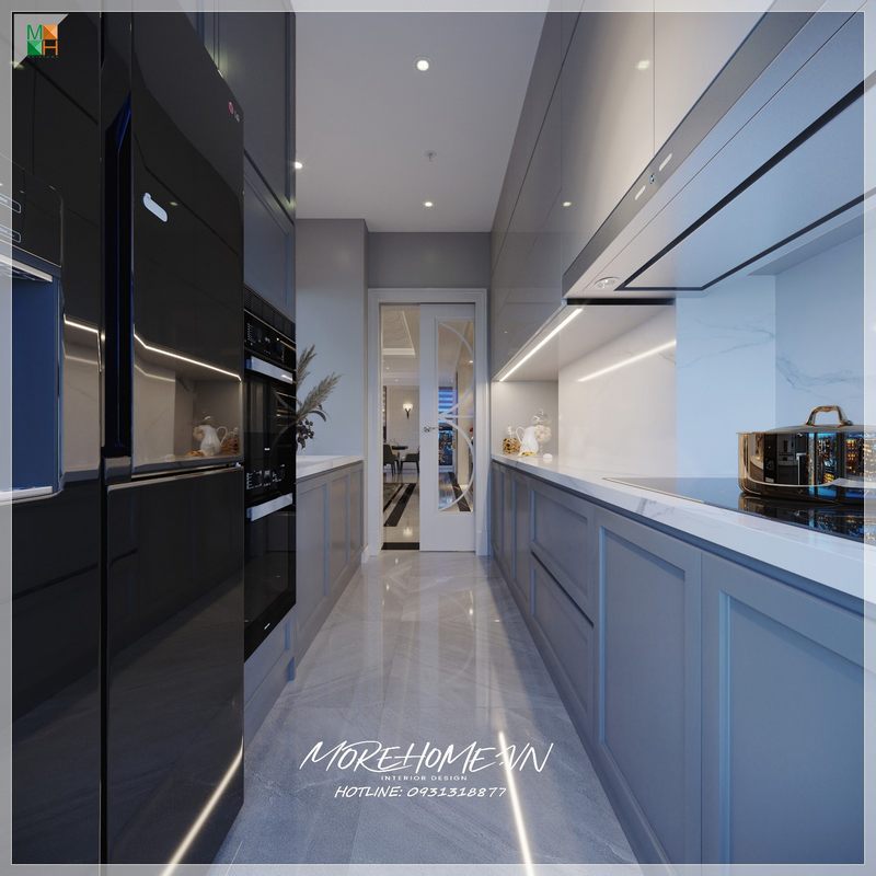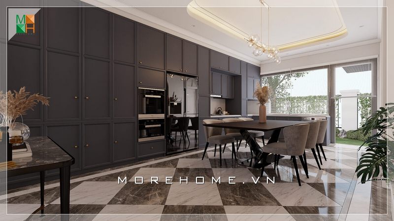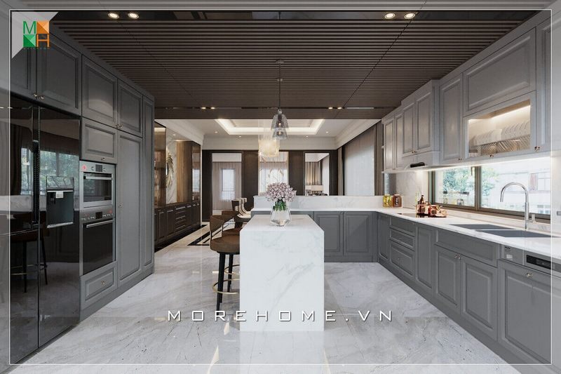 Thông thường bạn sẽ thấy khu vực bàn đảo sẽ nằm trong phòng bếp để có thể đáp ứng kịp thời nhu cầu ngay trong phòng bếp, điều này đòi hỏi phòng bếp phải khá rộng, nhưng nếu hẹp về bề ngang bạn vẫn có thể sở hữu không gian bếp đảo tuyệt đẹp như trong ý tưởng thiết kế nội thất tại biệt thự Parkcity bởi Nội thất Morehome.