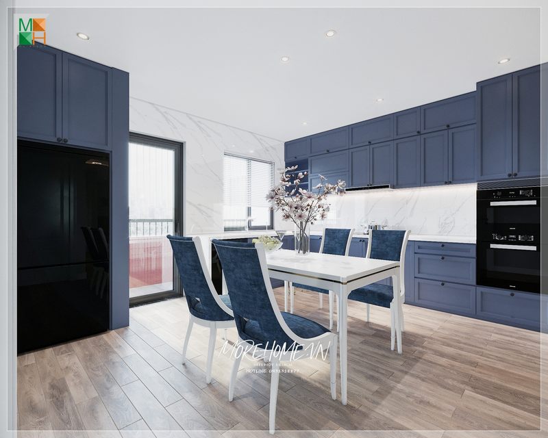 Thiết kế phòng bếp với tông màu xanh - trắng mát mẻ
