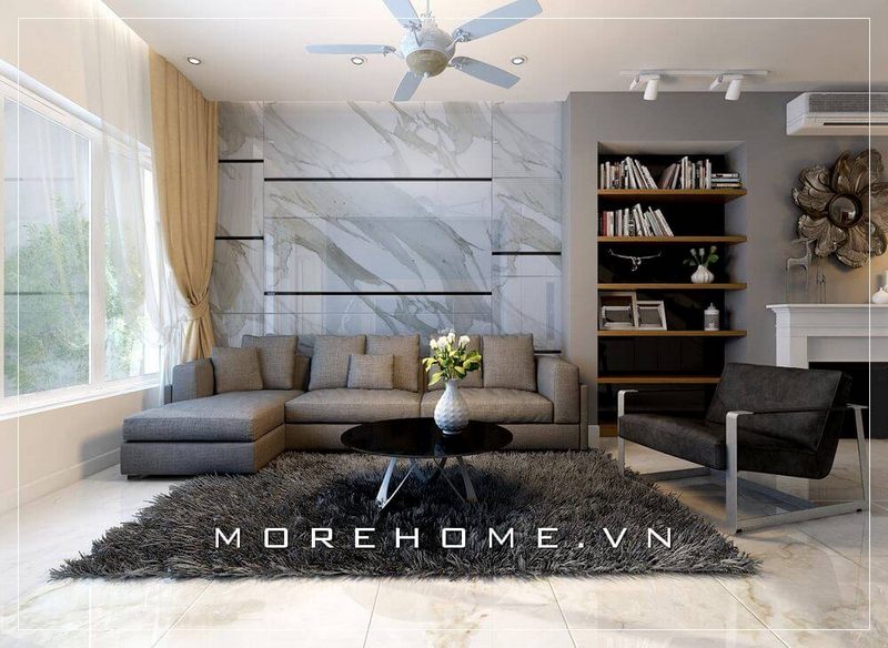 Độc đáo với thiết kế sofa hiện đại kiểu dáng góc tiện lợi được bọc vải màu ghi đầy tinh tế cho không gian phòng khách căn hộ chung cư.