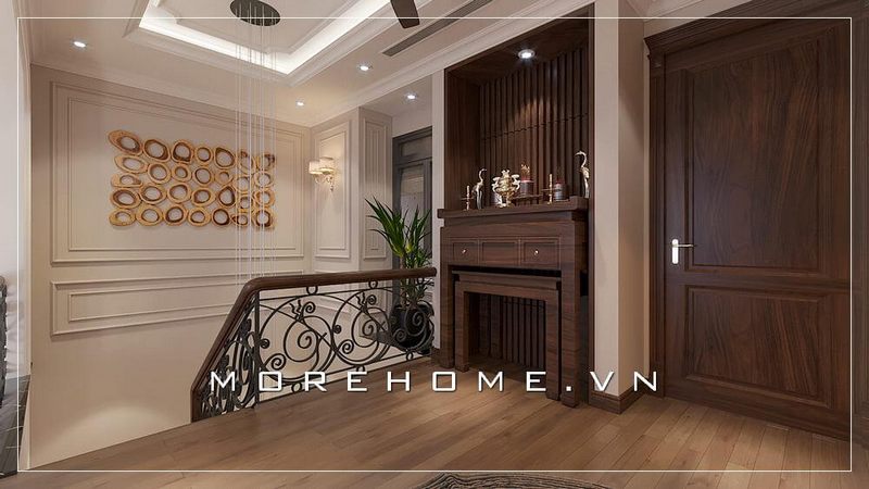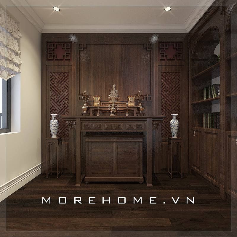 Trang trí nội thất phòng thờ đẹp với mẫu bàn thờ hiện đại kết hợp ốp gỗ bao quanh phòng, cùng nội thất gỗ cao cấp mang đến vẻ đẹp sang trọng và đẳng đẳng cấp