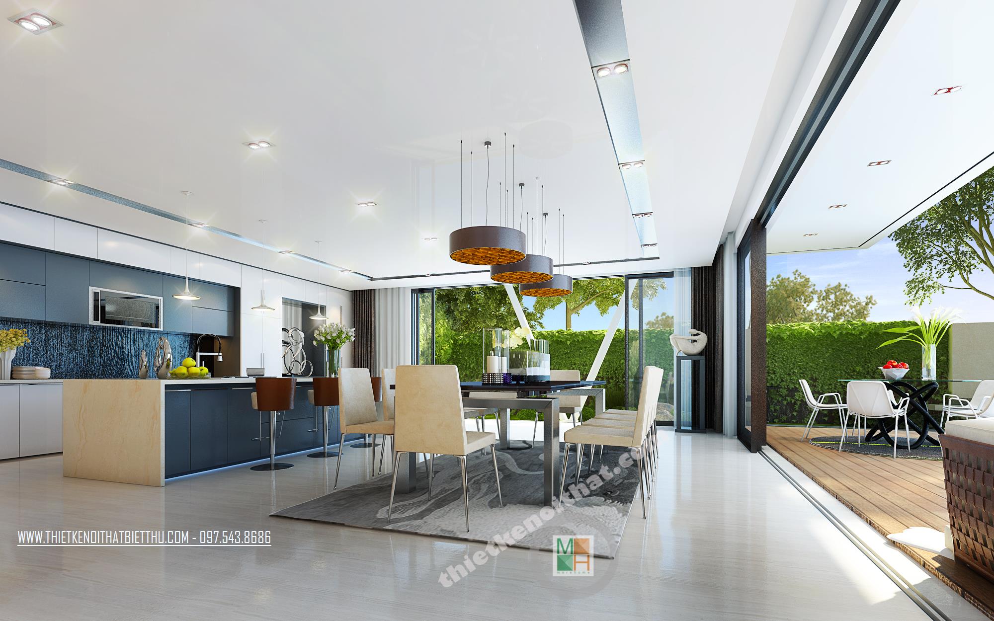 Bếp được thiết kế với hai tủ bếp đặt song song nhau, cửa kính ngăn cách bếp với không gian bên ngoài, ngăn mùi từ bếp ra ngoài, tránh ảnh hưởng tới phòng khách. Việc đặt bếp gần cửa sổ giúp lưu thông và đưa không khí tươi mới vào bên trong căn bếp.