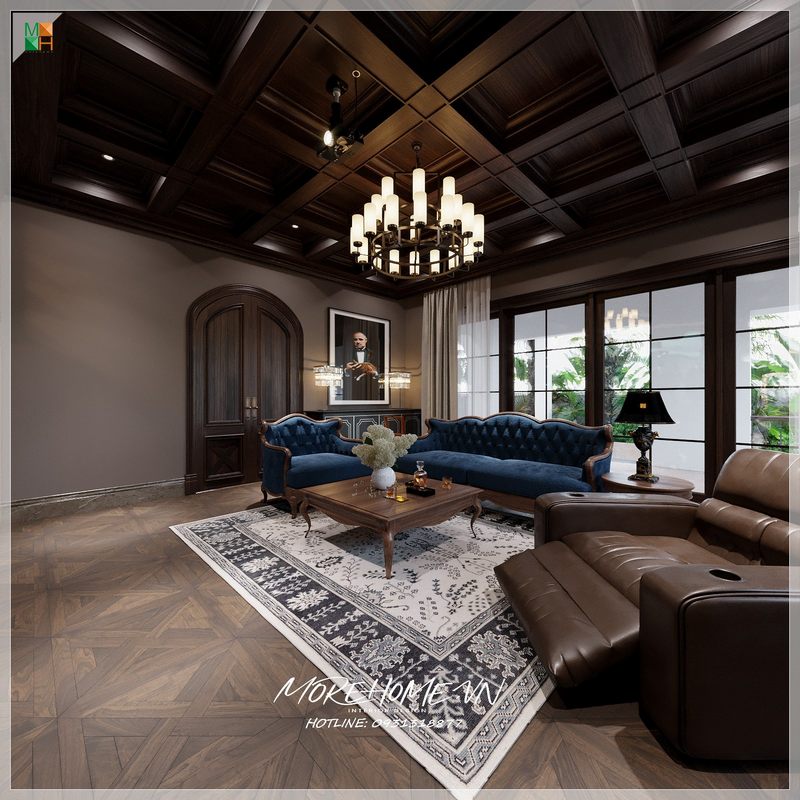 Thiết kế nội thất phòng ngủ biệt thự tân cổ điển sang trọng bởi mẫu gường ngủ gỗ óc chó cao cấp.